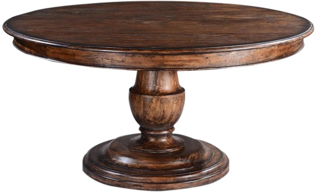 Crafted of select hardwood solids in a handsome distressed rustic pecan finish, this dining table features a shaped pedestal base. Its durable construction and timeless look make it perfect for family gatherings or everyday dining in a cozy, inviting space.Read More