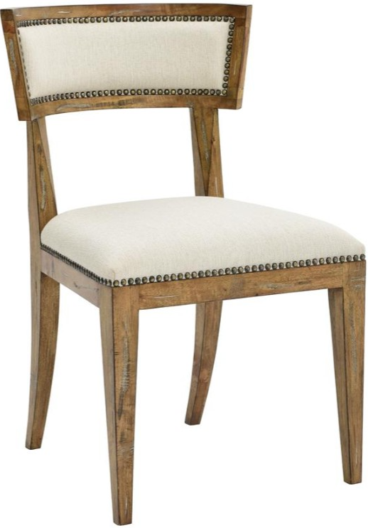 Crafted of hardwoods in a beechwood finish, this chair features padded back and seat cushions covered in a woven sand performance fabric in addition to tapered legs and nailheads in an antique bronze finish.Read More