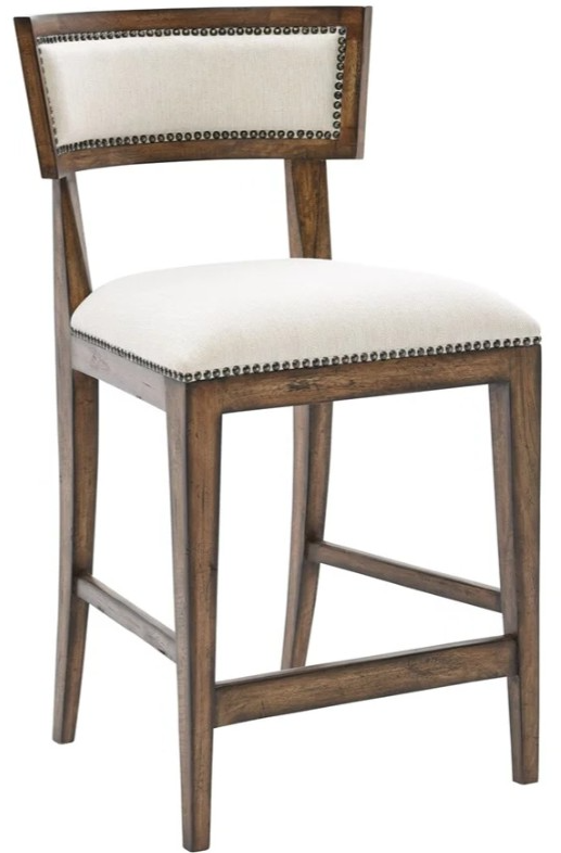 Crafted with select hardwood solids and veneers in a rustic pecan finish, this counter stool features a padded curved panel back and seat cushion upholstered in a light tan woven fabric, antique bronze finished nailheads, and tapered legs.Read More