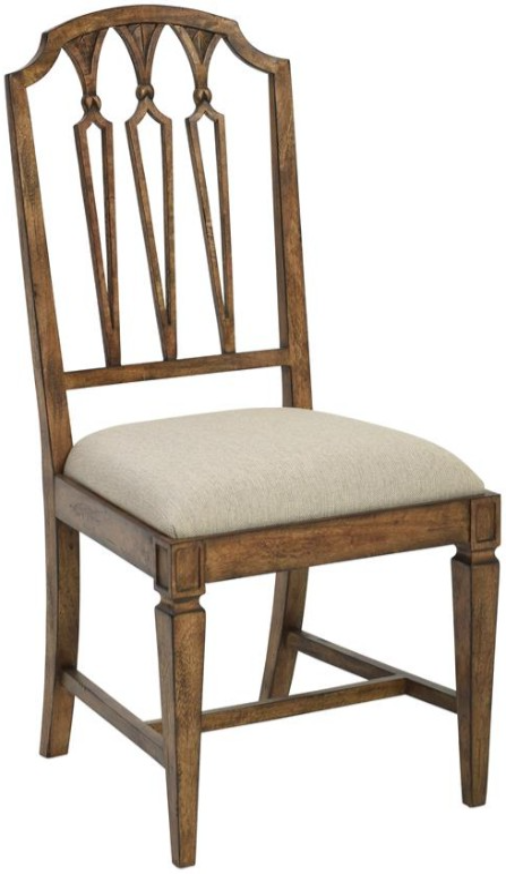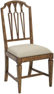 Crafted of hardwoods in a rustic pecan finish, this stately chair features a shaped top rail, decorative pierced back, padded seat cushion covered in a woven khaki fabric, stretcher base and tapered legs.Read More
