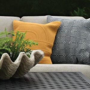Hand-woven and designed for outdoor use, this medallion-yellow pillow showcases an eye-catching interlocking pattern—an ideal accent for any chair or chaise in your outdoor space.