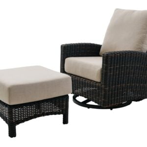 With an all-weather wicker frame in a hickory and dark brown finish, this club swivel chair features a plump back and seat cushion upholstered in a light khaki brown SPF-protected fabric with a taupe undertone, track arms, tailored base, with a 360-degree swivel and gliding base.